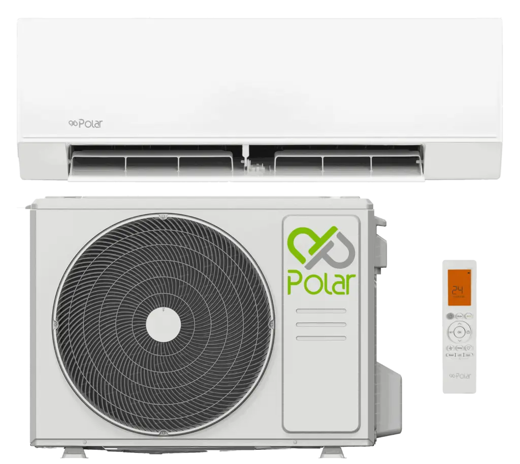 Magas energiahatékonyságú, R32, Inverteres splitklíma berendezés, hőszivattyús kivitel, infra szabályzóval, beépített wifi, alaplemez fűtéssel.